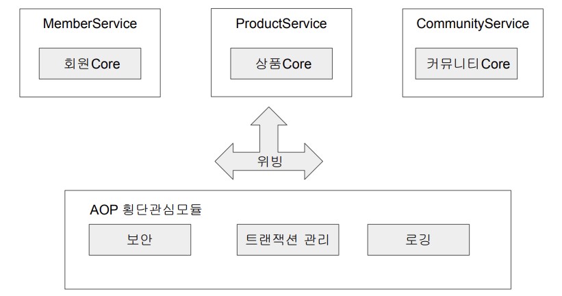 - 시스템의 여러 영역에 걸쳐 공통적이고 반복적으로 적용된 횡단관심사를 분리하여