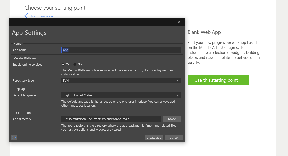그리고 파일 저장 위치 설정 후 Create app 버튼을 누르면 App 생성 완료 !