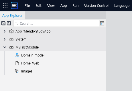 Mendix Studio Pro를 실행하면 왼쪽 Explore 부분에 이렇게 보이게 되고