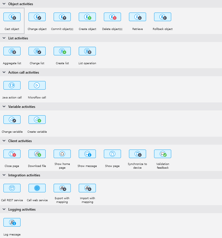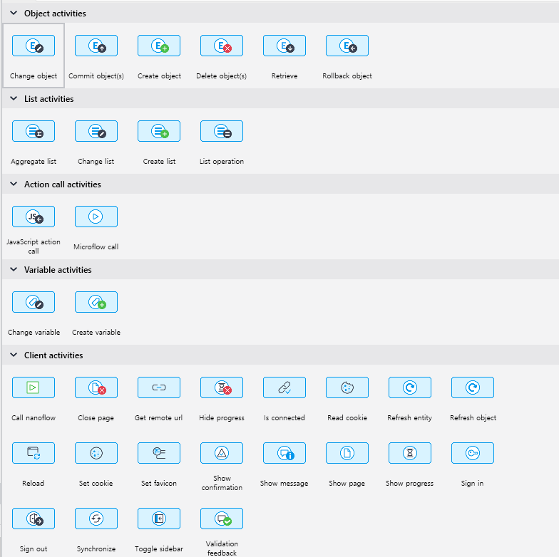 위에 있는 Action들이 Microflow / Nanoflow에서 사용하는 것들인데