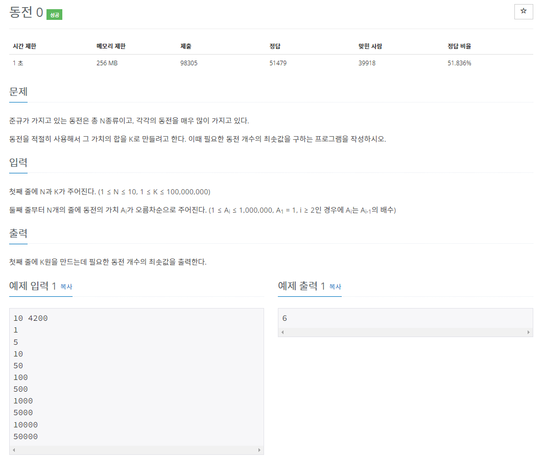 // 최소 동전갯수를 구하기 위해서는 역순으로 (50000 > 10000 > 5000 > 1000 > ~ ) 나눠준다
