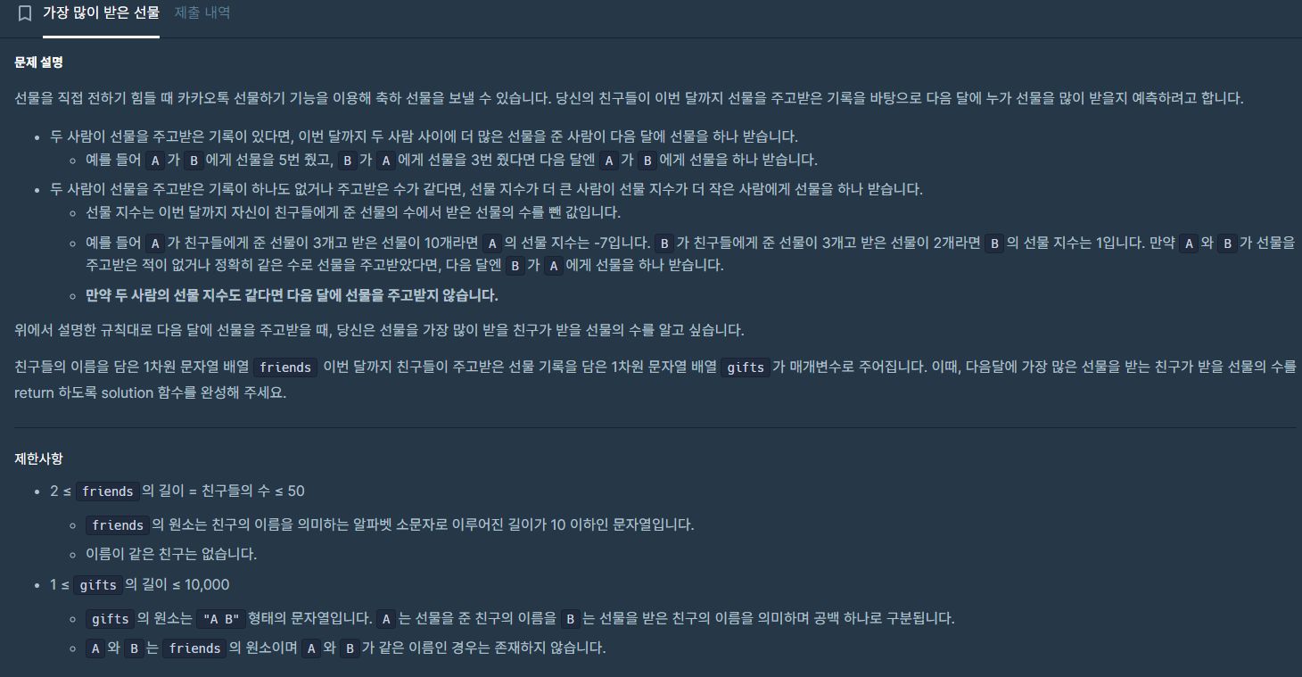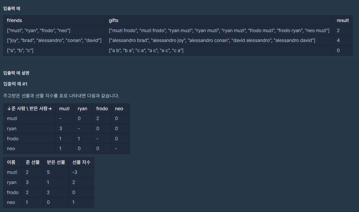 // 이차원배열 생성 후, 선물을 주고 받은 횟수를 저장