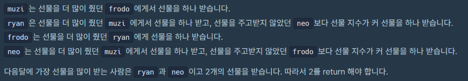 // j가 i보다 선물을 준 횟수가 많다면 -> nextMonthGift[j]++;