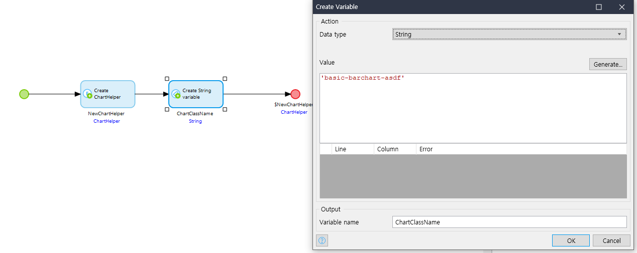 variable (변수) 생성 후 Data Type은 String, 내용은 방금 페이지에 생성한 컨테이너의 클래스를 지정후 OK