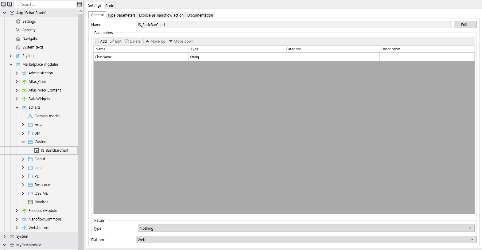 echart → Custom 폴더에 JavaScript Action (JS_BasicBarChart) 생성