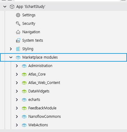 다운로드 완료되면 이렇게 Marketplace modules 내에 echarts가 추가된게 보임